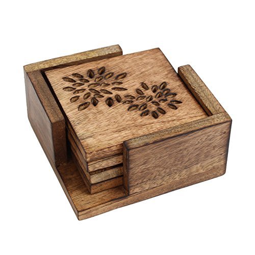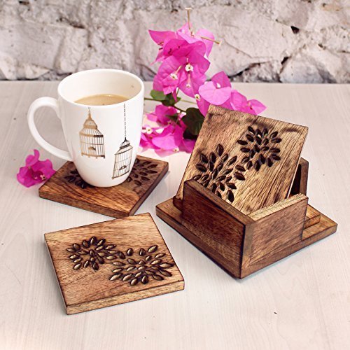 Wooden Drink Coasters Set of 4 and a Holder with Floral Design