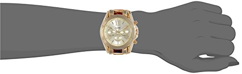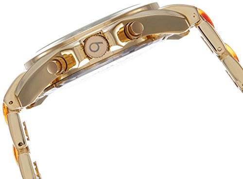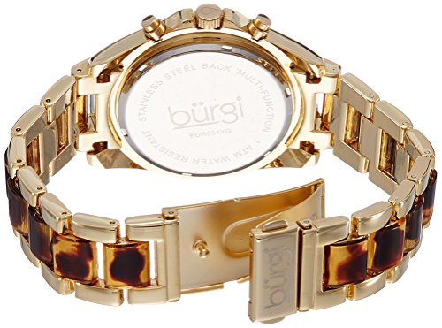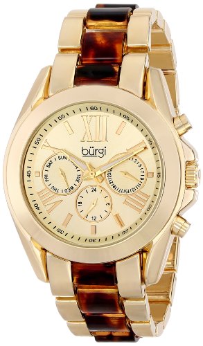 ReleaseDate : 2014-01-15 Studio : Burgi Publisher : Burgi Binding : Watch Product Description Gold-tone base metal case with a gold-tone base metal and tortoise-shell resin bracelet. Fixed gold-tone bezel. Gold-tone dial with luminous gold-tone hands and Roman numeral and index hour markers. Minute markers around the outer rim. Dial Type: Analog. Luminescent hands. Three multi-function sub-dials displaying: 24 hour, date and day of the week. Quartz movement. Scratch resistant mineral crystal. Pull / push crown. Screw down case back. Case diameter: 40 mm. Case thickness: 13 mm. Round case shape. Band width: 18 mm. Band length: 8 inches. Push button deployment clasp. Water resistant at 10 meters / 33 feet. Functions: date, day, GMT, second time zone, hour, minute, second. Casual watch style. Watch label: Hong Kong. Burgi Multi-Function Gold-tone Dial and Tortoise-shell Resin Ladies Watch BUR094YG. 0