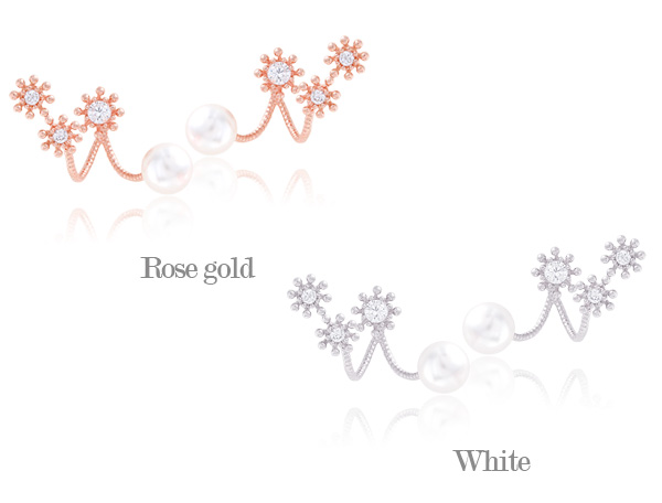 큐빅소재로 되어있는 꽃 모양 장식과 퓨어한 느낌에 진주가 매치되어 청초한 분위기를 만들어주며