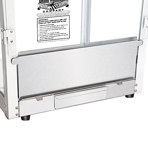 - Feature : Makes roughly 3-gallon of popcorn per batch; cleans up with water / Heavy-duty powder coated steel and stainless steel construction / Reject kernel tray kernel and oil scoop is included; popcorn scoop is included / Switches include: spot light warmer, stirrer and pot heater / 860-watt instead of 640; heated warming deck
