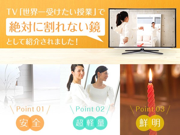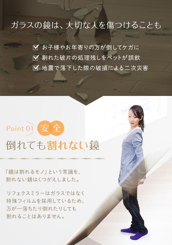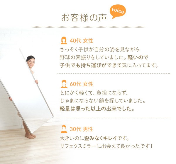 軽量です。市販のフックで簡単に壁に吊下げられます。女性や高齢の方でも手軽に部屋から部屋へ移動が出来ます。硝子ではなくフィルムですので落下したり衝撃を受けても割れたり飛散したりしないので安全です。厚みで映像がダブってしまうガラス鏡に比べ極薄(0.025mm)のフィルムで像を反射するのでゴーストが無く鮮明にくっきりと映し出します。高透明なフィルムを使用していますので肌の色が自然に映ります。反射率が83%と高く鮮明に映し出します。