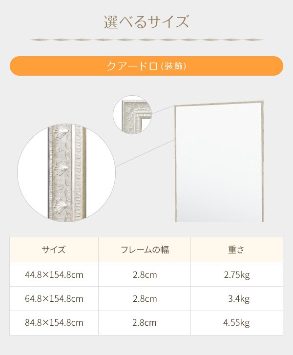 【商品名】プロ仕様!割れない鏡 【REFEX】リフェクス クアードロミラー(額縁) 姿見 W84.8cm×154.8cm×3.4cm 四方飾縁 W2.8cm シルバー【日本製】