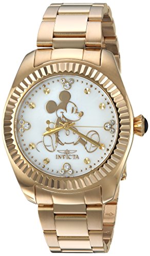 Invicta 24913 Disney women's dive watch features a 40mm wide and 12mm thick yellow gold plated solid stainless steel case with a fixed bezel and textured push-pull crown. Invicta 24913 is powered by Japanese TMI PC21J quartz movement. This beautiful watch also features a gold tone Mickey mouse engraved sharp looking milky white oyster dial with gold tone luminous hands and 12 crystals accented dot hour markers, scratch resistant flame fusion crystal and water resistant to 200 meters. Invicta 24913 is equipped with a 20mm wide yellow gold plated solid stainless steel bracelet with a fold over safety lock clasp. Invicta 24913 women's Disney white oyster dial yellow gold steel bracelet crystal dive watch is brand new and comes in an original Invicta gift box and is backed by a 5 year limited warranty.Feature