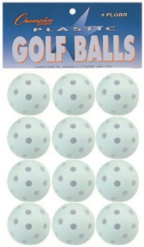 Studio : Champion Sports Publisher : Champion Sports Binding : Misc. Product Description Designed for safety and all around fun, the Champion Sports Plastic Golf Balls are perfect for multiple uses. Use them to perfect your golf swing indoors and out. You can also use them in a P.E. class or recreational club to play paddle games, for gentle tossing, or for anything else you can think of! These lightweight plastic golf balls come in a pack of 12 and feature attractive retail packaging. 0