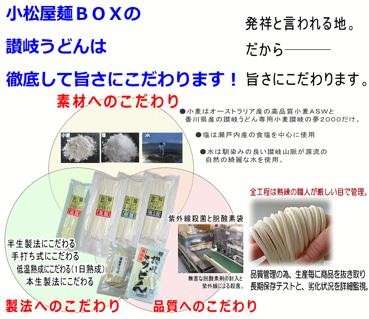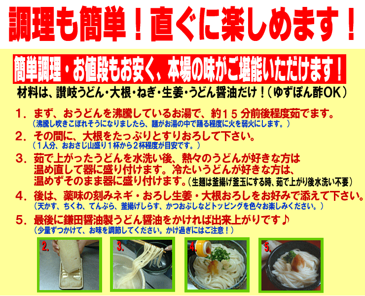 | 調理方法 | 多目のお湯でうどんを茹でた後、流水でもみ洗いをして表面のぬめり、塩分を 取り除き、器に盛ります。 |