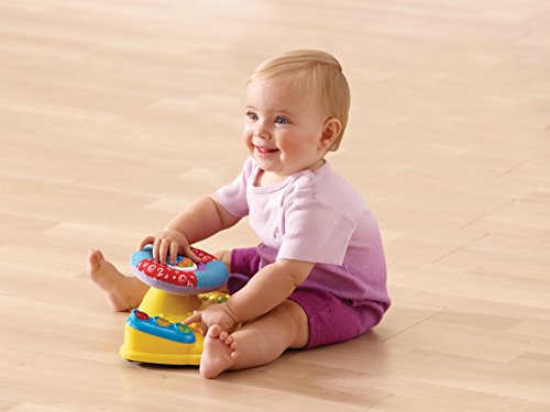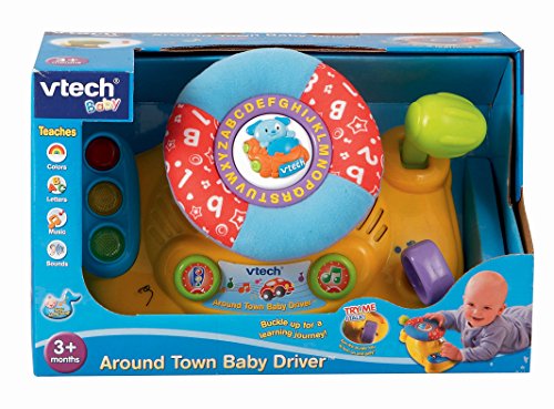 -. Binding : Toy -. Brand : VTech Baby -. Color : Multicolor -. EAN : 0070633526888 -. Feature : Babies role-play toy allows kids to pretend driving by turning the ignition key and the soft; fabric wheel is great for safe play that teaches letters, colors and more / Baby toy allows toddlers to turn the ignition key; steer with the soft fabric wheel and switch gears with the movable joystick to help develop motor skills / Driving toy has a twinkling traffic light that attracts babies attention; music toy plays upbeat melodies and sound effects / Infant learning toy plays 35+ sing-along songs, music sound effects and fun phrases; put your baby on the fast lane to fun / Intended for babies 3 months to 2 years of age; includes 2 AAA batteries for demo use only, new batteries recommended for regular use -. IsAdultProduct : 0 -. IsAutographed : 0 -. ItemPartNumber : 80-073700 -. Label : V Tech -. Manufacturer : V Tech -. Model : 80-073700 -. MPN : 80-073700 -. PackageQuantity : 1 -. PartNumber : 80-073700 -. ProductGroup : Toy -. ProductTypeName : TOYS_AND_GAMES -. Publisher : V Tech -. Size : 10.40 x 5.90 x 4.70 Inches -. Studio : V Tech -. Title : VTech Baby Around Town Baby Driver -. UPC : 731631020579 -. Warranty : 90 day warranty against manufacturer defects