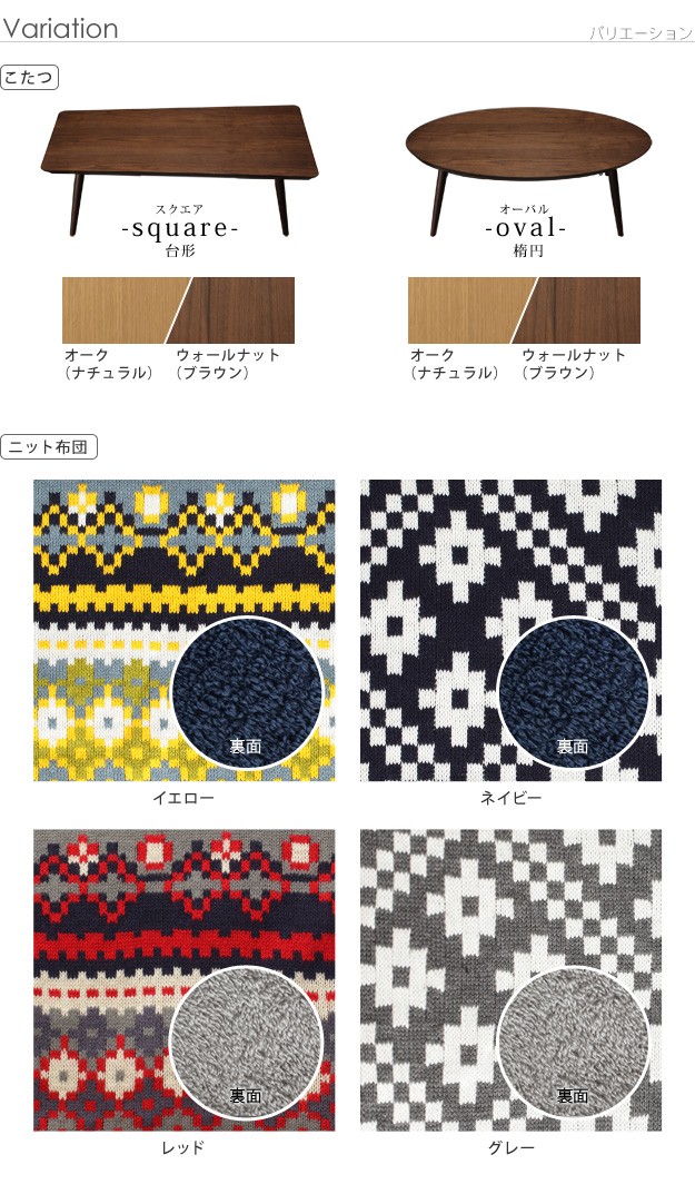 カラー:こたつ-オーク(ナチュラル)・ウォールナット(ブラウン)、布団-グレー・ネイビー・イエロー・レッド