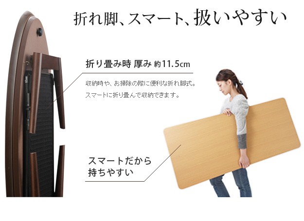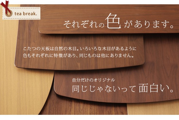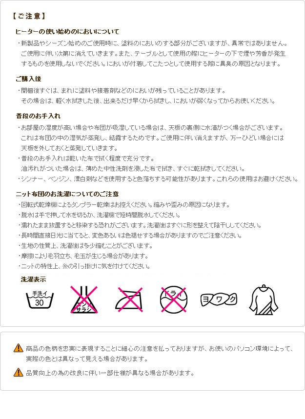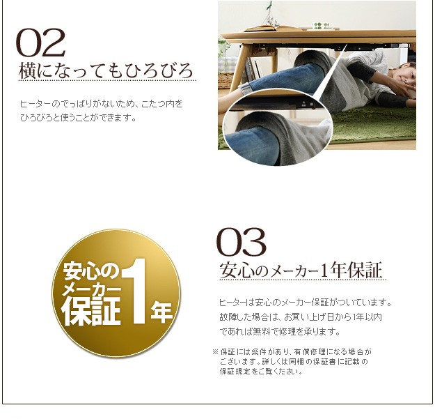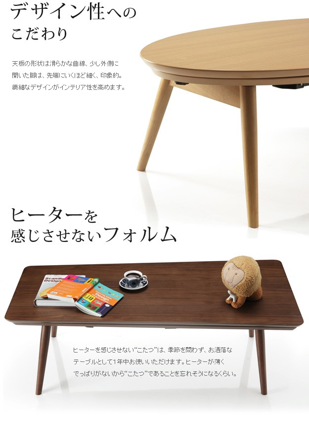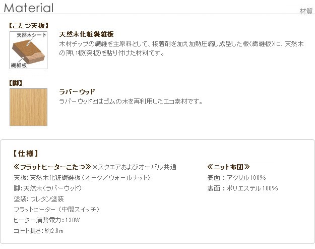 材質:こたつ天板-天然木化粧繊維板(オーク/ウォールナット)、こたつ脚部-天然木(ラバーウッド)・ウレタン塗装、布団表面-アクリル100%、布団裏面-ポリエステル100%