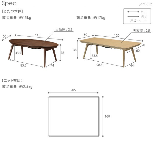 サイズ:オーバル-幅115x奥行60x高さ38cm・約15kg、スクエア-幅120x奥行60x高さ38cm・約17kg、布団-205x160cm