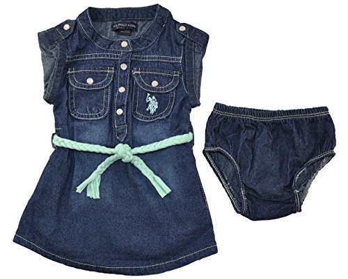 -. Binding : Apparel -. Brand : U.S. Polo Assn. -. Color : Dark Denim Blue -. Department : baby-girls -. Feature : 100% Cotton / Made In Bangladesh / Machine Wash / Short sleeve dress with diaper cover, 2 pockets, embroidered pony logo -. Model : A0KQ38D3 -. ProductGroup : Apparel -. ProductTypeName : DRESS -. Title : US Polo Assn Baby Girls Dark Blue Denim Dress W/Panty