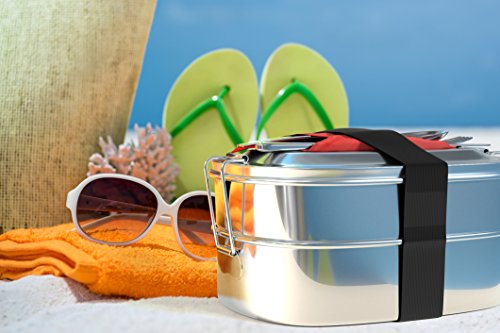 VERSATILE & EASY TO CARRY. This lunchbox is easy to carry with bonus strap included or you can use the strap to secure utensils (napkin/utensils not included). This stainless steel food container is great for lunches, office meals, camping, leftovers or picnics. And all the food is easy to see and quickly eat without the need for separate containers