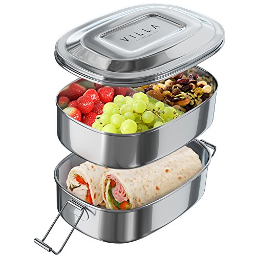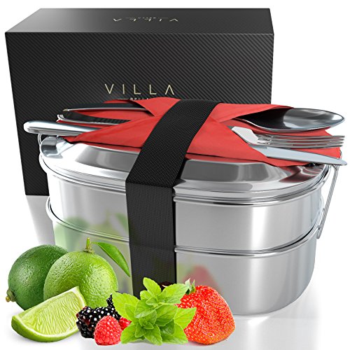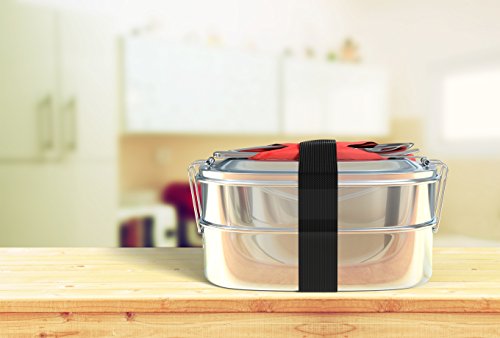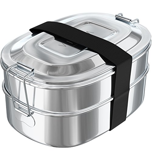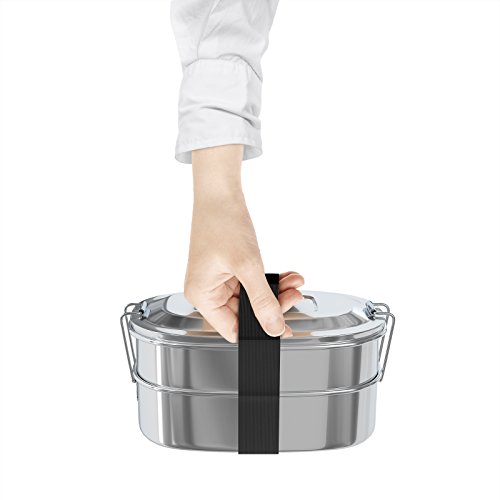 Stainless Steel Lunch Box Food Container. Two Layer Lunchbox with Divided Compartment Sections. Easy Carry Strap plus Extra Secure Clips. Eco-Friendly Stainless Steel Lunch Container. Dishwasher Safe