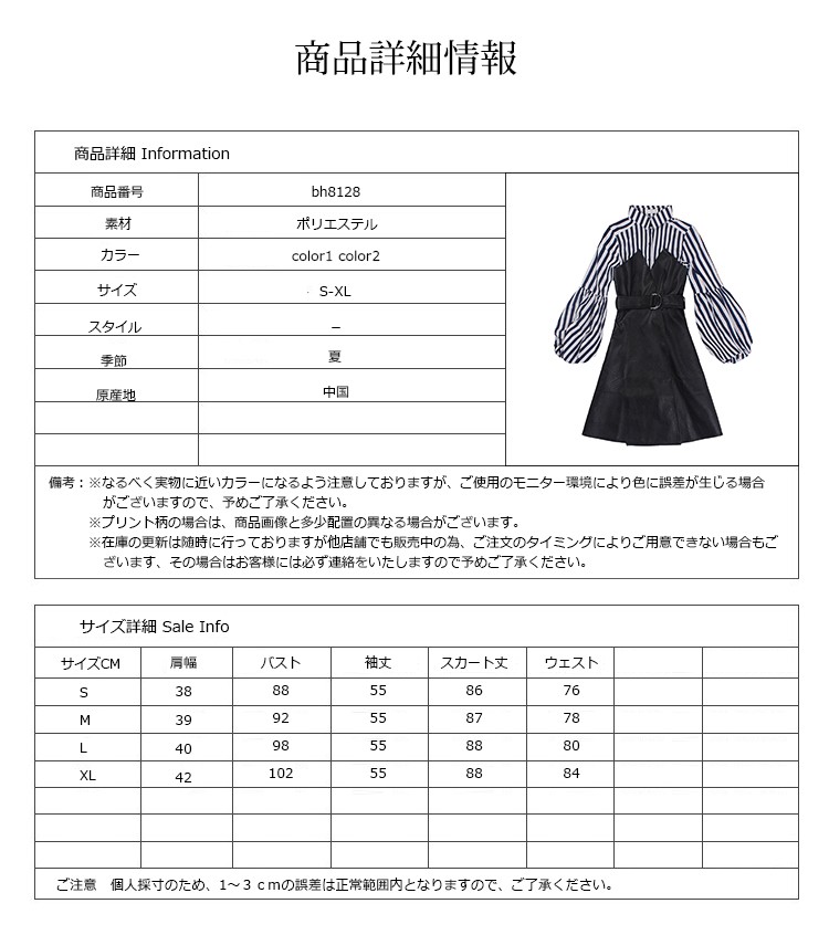■素材:ポリエステル■カラー:color1-color2■サイズ:Sスカート丈86バスト88肩幅38袖丈55ウェスト76Mスカート丈87バスト92肩幅39袖丈55ウェスト78Lスカート丈88バスト98肩幅40袖丈55ウェスト80XLスカート丈88バスト102肩幅42袖丈55ウェスト84■原産地:中国