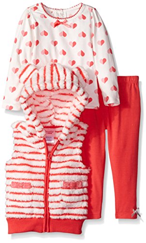 -. Binding : Apparel -. Brand : Nannette -. Department : baby-girls -. Feature : 3 button closure on the back / Elastic all around pant -. Label : Nannette Baby -. Manufacturer : Nannette Baby -. PackageQuantity : 1 -. ProductGroup : Apparel -. ProductTypeName : SHIRT -. Publisher : Nannette Baby -. Studio : Nannette Baby -. Title : Nannette Baby Girls' 3 Piece Vest Set with Hoodie and Heart Printed Tee 3 piece hooded vest set. Hood has mouse ears on it. The vest has 2 pockets with tacked on bows. Long sleeve heart printed tees with a bow under collar and legging with a bow tacked on by leg