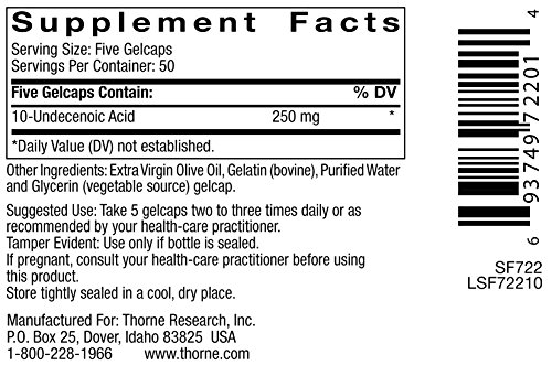 Undecylenic acid, fatty acid support of healthy GI and vaginal flora.Since 1984, Thorne has set the standard for the exceptional formulation and quality manufacturing of nutritional supplements. Thorne delivers premium, science-based products, a health diagnostics technology platform, and the latest in medical education. With more than 350 products, Thorne is the most dispensed brand by 30-40 year old health-care practitioners. Thorne is dedicated to improving the health of our community as well as increasing the knowledge of nutritional health and wellness. Since 2012, Thorne has partnered with educational institutes and local charities to donate more than $1M in products and profits.