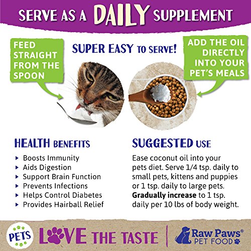Raw Paws Pet Coconut Oil Supplement is an excellent Superfood offering a multitude of health benefits for dogs and cats. Add this 100% natural, cold pressed and unrefined coconut oil to your cat or dog's food as a daily supplement or right from the spoon as a tasty treat. Organic Coconut Oil, when taken daily, reduces allergies, improves skin and coat, strengthens the immune system and protects against fleas and ticks. Your pet will also be more energetic because Coconut Oil helps to balance the thyroid and boost metabolism helping to manage weight. Our raw, organic virgin coconut oil is sourced from coconuts naturally grown in the Philippines and contains one ingredient: USDA Certified Organic Coconut Oil.