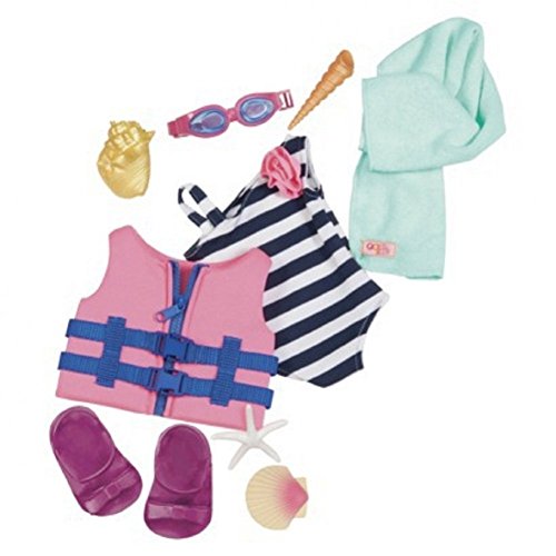 -. Feature : Set includes life vest, bathing suit, towel, goggles, pair of sandals and 4 shells. / Fits most 18" Dolls including American Girl / Easy to use pieces / Trusted Quality
