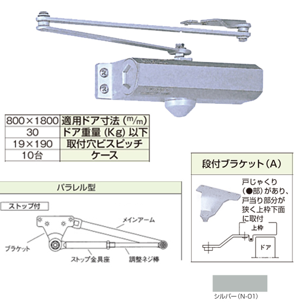 ●仕様:パラレル型・ストップ付(ストップ角度70~180°)・ドア重量30kgまで・段付ブラケット