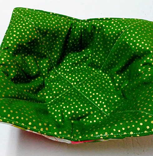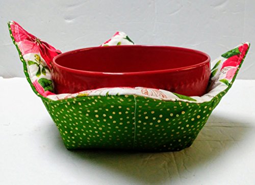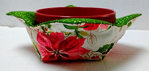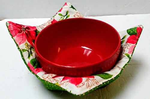 Product Description Soup Cozy- Protect hands and furniture from hot bowls of soup, chili, and oatmeal with a soup bowl cozy that's as cute as it is functional! Perfect for cold bowls of ice cream, too! Insulate your coffee pot while on the table. Versatile fabric bowl! You will receive one Poinsettia/Green dots pattern as shown. Great for hostess gifts, housewarming gifts or for your own family. (My kids love using them!) Use as a fabric bowl on counters for keys, fruit or other small items. Measures approx 8" square, fits a standard soup/cereal/ice cream bowl. Machine wash gentle, lay flat or hang to dry. May be used directly in the microwave for short periods of time, not meant for extended heating times. 0