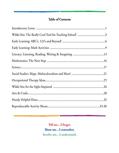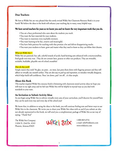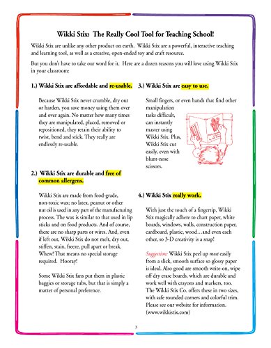 A 36-page Wikki Stix manipulative Resource book for hands-on learning. Cross-curricular ideas for teachers k-8. If you are new to Wikki Stix, they are simply made of knitting yarn and food-grade wax. Non-toxic, they do not contain gluten, latex, nor peanut or other nut oils or by-products. They are endlessly reusable, will not break or tear apart but cut easily with scissors. Wikki Stix conform to all consumer safety regulations and are widely used as a teaching tool in schools. They are excellent for learning letters and numbers. and they can be pressed together for 3-D creativity too! With Wikki Stix, there is no right or wrong way to play! Proudly Made in America!.Feature