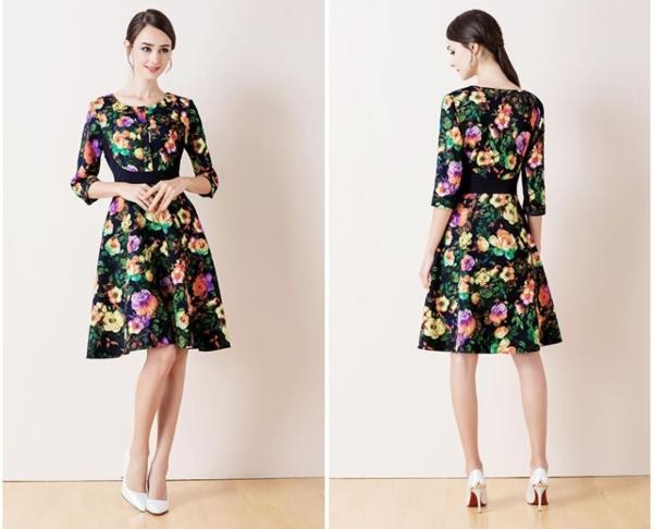 鮮やか花柄プリント フレアワンピース 黒/ XL