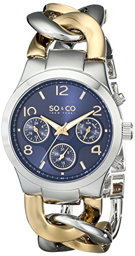-. Binding : Watch -. Brand : SO&CO New York -. Color : Two Tone/Blue -. Department : womens -. EAN : 0847988057189 -. Feature : Watch featuring round blue dial with three subdials and logo under 12 o'clock / Stainless steel 38 mm case and mineral dial window / Quartz movement with analog display / Two-tone stainless steel link bracelet with fold-over-clasp closure / Water resistant to 165 ft -. Label : SO&CO MFG -. Manufacturer : SO&CO MFG -. Model : 5013.2 -. MPN : 5013.2 -. PackageQuantity : 1 -. PartNumber : 5013.2 -. ProductGroup : Watch -. ProductTypeName : WATCH -. Publisher : SO&CO MFG -. Studio : SO&CO MFG -. Title : SO&CO New York Women's 5013.2 SoHo GMT Day and Date Stainless Steel Two Tone Chain Link Bracelet Watch -. UPC : 847988057189
