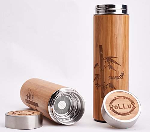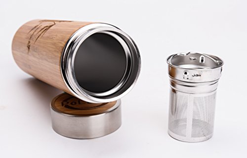 • DESIGNED TO STAND OUT - Add a touch of nature to your life and working space and get complimented for your ECO choice. The bamboo exterior is so stylish, eco-friendly. Travel Coffee Mug for hot and cold beverages; 16-ounce/450ml capacity Ideal Size and a Big Infuser 2 in 1, which is convenient to brew not only coffee, but also leaf and fruit tea. Each bottle is unique and different from the other due to the bamboo wood.