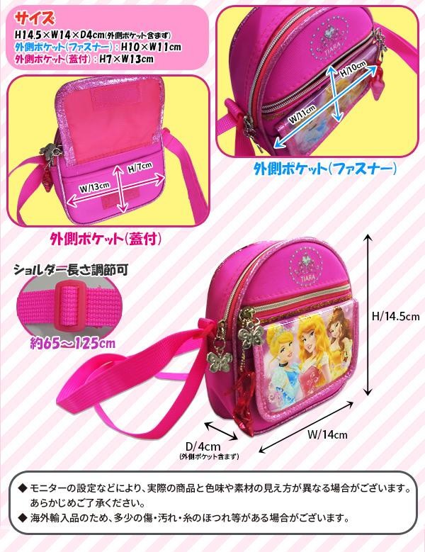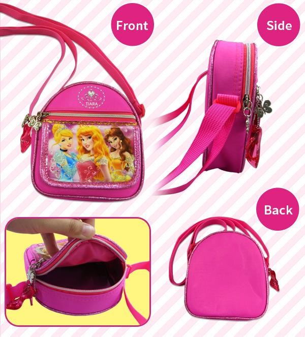 | プリンセスのイラスト入りの可愛いショルダーバッグです。国内ライセンス商品は落ち着いた柄・色合いが多いのですが、派手でかわいいデザインは海外輸入ならでは♪ |