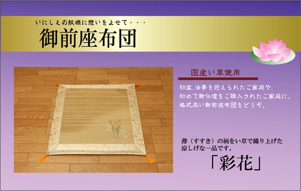 お盆の準備や、新しくご仏壇をご購入された方にお勧めの御前座布団です。ギフトケースでお届けを致しますので、贈り物にもピッタリです。有機肥料(牛糞、豚糞、稲ワラなどをブレンドしたもの)を使った減農薬栽培の国産(九州産)のい草を使用しています。一本一本が太く、表皮が厚く繊維がキメ細かいので弾力性があり、耐久性に優れています。い草には空気の自然浄化作用、湿度の調節作用などがあります。また汚れにくく、使用するうちに黄金色に変化し味が出ます。い草に青森ヒバ加工を施しています(抗菌、防臭効果)。中材にはポリエステルわたを凝縮させて仕上げた、固わたを40mm使用しております。程良い弾力性があり、ヘタリにくいのが特徴です。