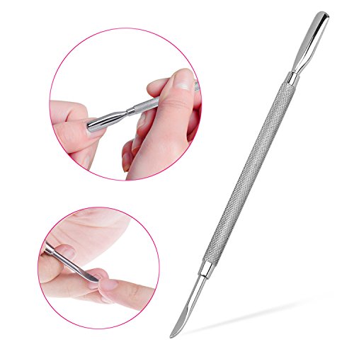 CUTICLE PUSHER----It works very nicely pushing the cuticles back without scratching the nail surface, fits the cuticle bed nicely, and gets dirt out from under even thick deep crevices next to nails without pricking your skin under the nail. The criss-cross pattern on the middle part that adds grip, which is a wonderful safety feature when you are cleaning sensitive spots.