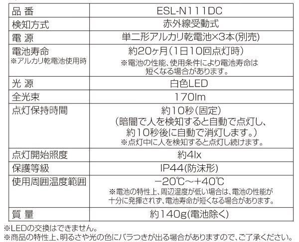 軒下などの屋外に設置できる防雨仕様(IP44 防沫形)のLEDセンサーライトです。乾電池式なのでコンセントがない場所に設置でき、電気代もかかりません。 |