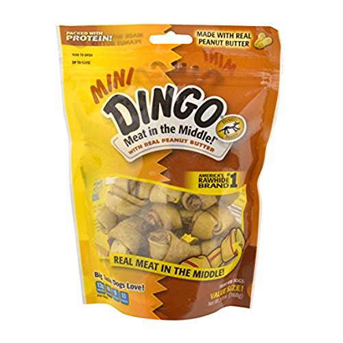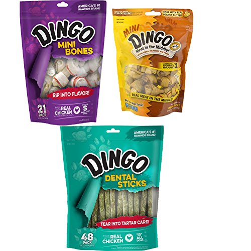-. Binding : Misc. -. Brand : Dingo -. EAN : 0769526017175 -. Feature : Includes (3) Bag Of Dingo Dog Treats. (1) Dingo 48 Count Dental Sticks, (1) Dingo 21 Count Meat In The Middle, & (1) Dingo 14 Count Meat In The Middle Peanut Butter / Great for dogs of all sizes / Promotes clean teeth from the natural action of chewing / Combination of real chicken wrapped with premium Rawhide -. Label : Dingo -. Manufacturer : Dingo -. PackageQuantity : 1 -. ProductGroup : Pet Products -. ProductTypeName : PET_SUPPLIES -. Publisher : Dingo -. Studio : Dingo -. Title : Dingo Dental Sticks, Dingo Meat In The Middle, & Dingo Meat In The Middle Peanut Butter Dog Treats -. UPC : 769526017175