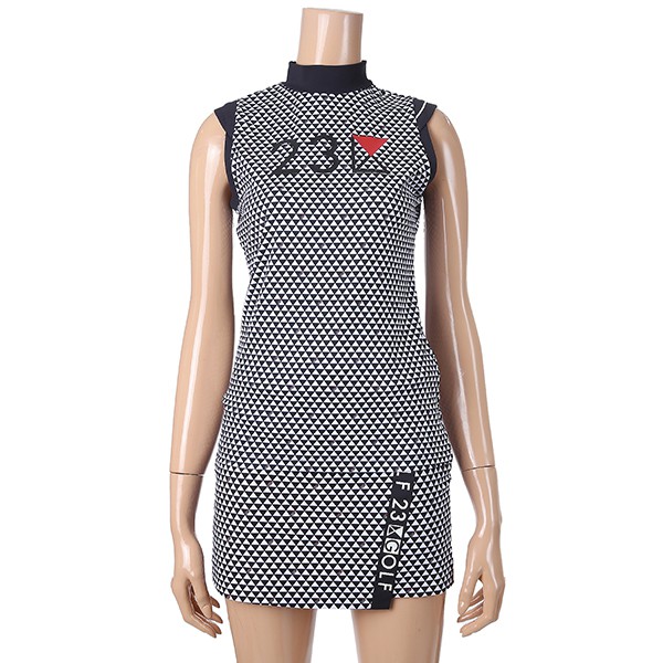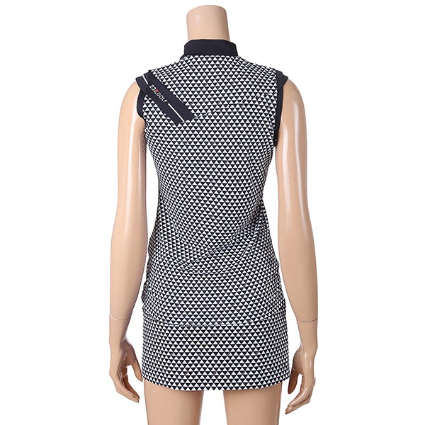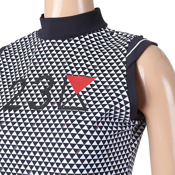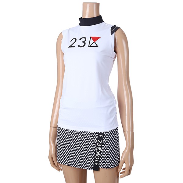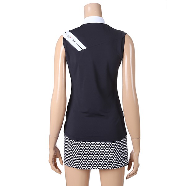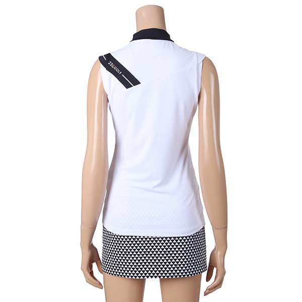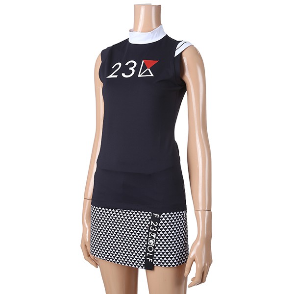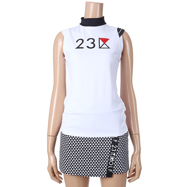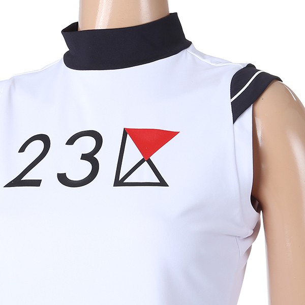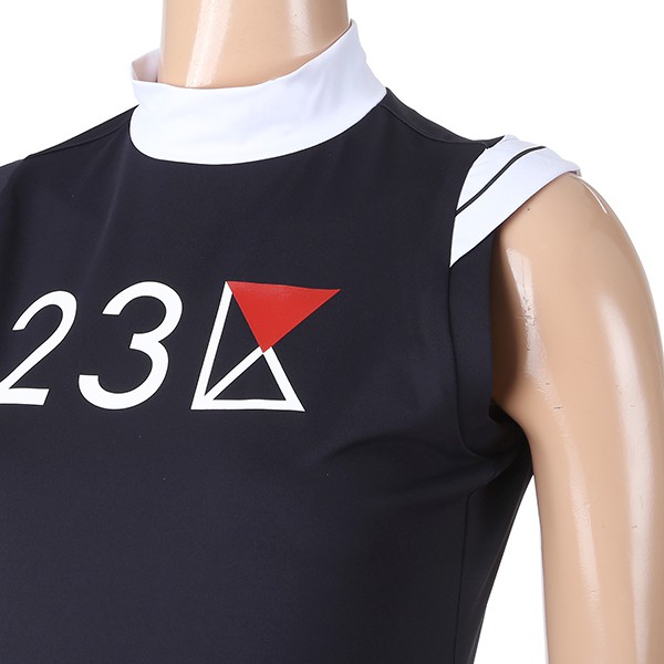 - 23KU 로고 포인트 어깨절개 라인 SLEEVELESS 하이넥 티셔츠.