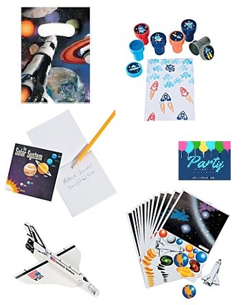 -. Feature : 12 - Favor Bags (9" x 6.5") / 12 - Space Scene Sticker Sets & 24 - Spaceship Stampers / 12- Foam Space Gliders - 5" (simple assembly) / 12 - Space Notepads (4" notepad, 30 blank pages) / You will also receive a "Party Planning Checklist" PDF