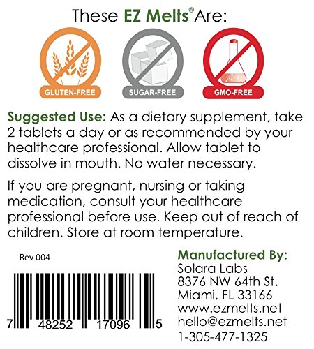 EZ Melts® are a full line of fast melting dietary supplements that are specially formulated to melt in the mouth quickly without the need for water. They are perfect for those who dislike swallowing pills or are prevented from doing so for medical or lifestyle reasons, or simply for those who want the benefits of quality, great tasting supplements. Advantages of EZ Melts®: Tablets melt rapidly in the mouth with a smooth feel - no need for water or swallowing large pills. Active ingredients become readily available for absorption before entering the digestive tract. Great tasting formulas featuring popular ingredients across the spectrum of health categories. We uphold the highest standards of regulatory compliance to ensure that our products are manufactured with safety, integrity and in accordance with the current Good Manufacturing Practices (cGMPs). We are an FDA-registered, USDA-approved facility and have been audited by regulatory authorities.Feature