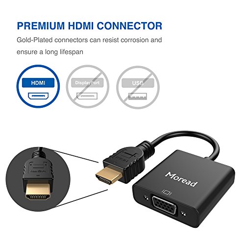 Studio : Moread Publisher : Moread Binding : Electronics Product Description Stable Signal, Reliable Connection The Moread HDMI to VGA adapter provides a cost-effective and easy solution for connecting a desktop, laptop, or other devices with HDMI port to a VGA display such as monitor, projector or TV. Connect the HDMI male end of the converter to the HDMI port of your HDMI device, and connect the VGA female end to your VGA cable from the display.
