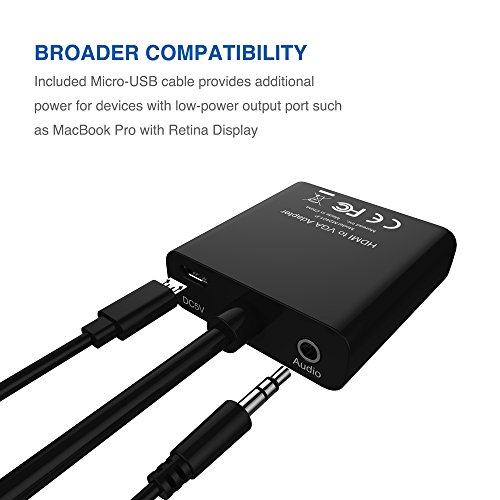 Broad Compatibility - Supports low-power HDMI devices such as SONY PlayStation 4, Apple MacBook Pro with Retina Display, Mac mini, and Apple TV - To work with low-power HDMI devices, please plug the included USB to Micro USB cable into the USB port of your computer/wall charger and the DC port of the HDMI to VGA adapter.