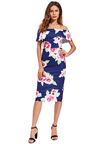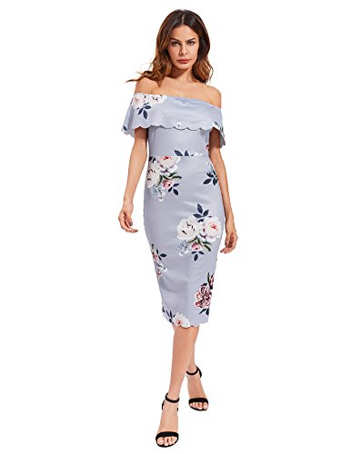 Features: off shoulder, short sleeve, floral, ruffle, slim fit, elastic stretch, knee length, scalloped hem