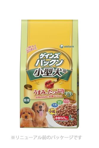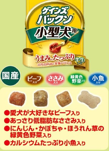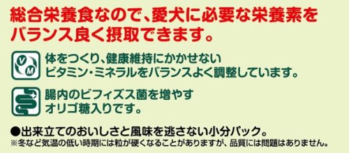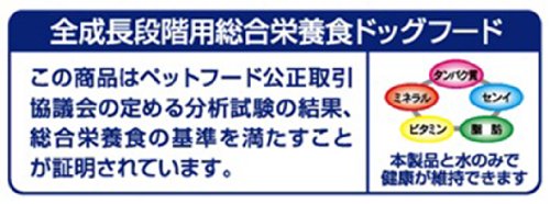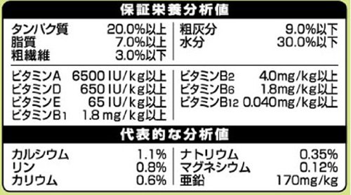 素材構成:穀類(トウモロコシ、小麦粉、脱脂米糠、等)、肉類(チキンミール、ビーフパウダー、ササミパウダー、等)、豆類(脱脂大豆、大豆粉)、糖類(ブドウ糖果糖液糖、オリゴ糖、等)、動物性油脂、ビール酵母、ハーブ、魚介類(乾燥小魚、等)、野菜類(ホウレンソウパウダー、ニンジンパウダー、カボチャパウダー、等)、プロピレングリコール、ミネラル類(カルシウム、塩素、銅、ヨウ素、ナトリウム、リン、亜鉛)、乳化剤、保存料(ソルビン酸K)、pH調整剤(リンゴ酸、クエン酸)、着色料(二酸化チタン、赤色106号、黄色4号、黄色5号、青色1号)、ビタミン類(A、B1、B2、B6、B12、D、E、K、パントテン酸)