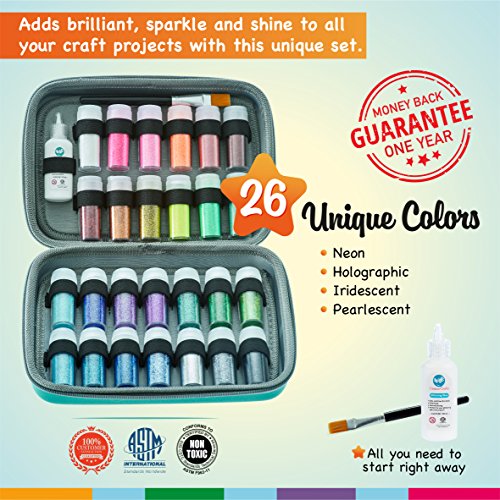 - COMPLETE SET : Package includes a hard shell EVA case, 26 sparkling extra fine glitters, 1 glitter glue, 1 brush - all you need to start crafting immediately