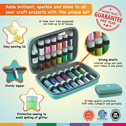 - UNIQUE CASE ORGANIZER: No more plastic blister packing - Our set includes a durable hard carrying case with sturdy zipper to protect and keep your supplies safe and accessible. The internal strap will hold your tubes in one place. Stop wondering how to store your glitter.