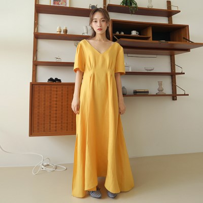 브이 넥 라인으로 여성스럽게 쇄골이 드러나며 바스트에 핀턱 디테일이 라인을 잡아줍니다. 차르르 떨어지는 롱한 기장감은 내추럴한 실루엣을 보이며 딥한 슬릿이 멋스러움을 더해주었습니다. 자연스러운 주름은 볼륨감 있고 풍성한 플레어단을 연출해주며 봄에 산뜻한 컬러들로 데이트룩을 완성해보시면 좋습니다.