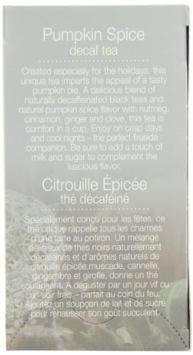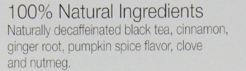 -. Feature : Pack of 6, 18-count boxes / A delicious blend of naturally decaffeinated black teas and natural pumpkin spice flavor / Richly spiced tea / Case of six boxes each containing 18 tea bags (total of 108 tea bags) / Holiday blend of black teas and natural pumpkin spice flavor create the taste of pumpkin pie that is decaffeinated naturally / Excellent with milk and sugar that complement the luscious flavor / Kof-K Kosher certified, decaffeinated, ships in Frustration Free Packaging / Blended in the USA, with natural ingredients from around the world