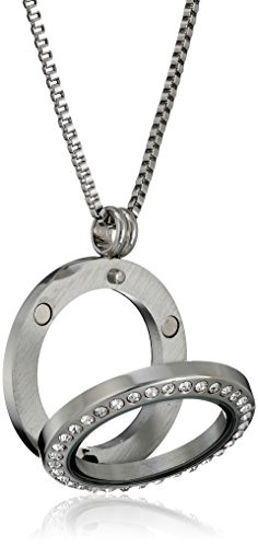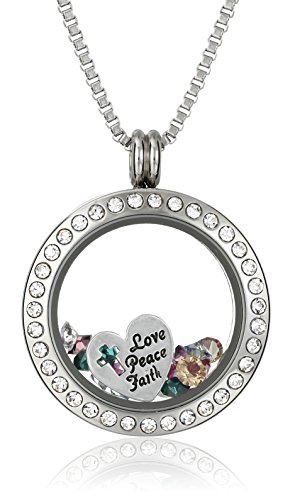 Stainless steel round pendant necklace featuring Swarovski crystal border and transparent locket center with loose multicolor crystals and engraved "Love Peace Faith" cross cutout charm