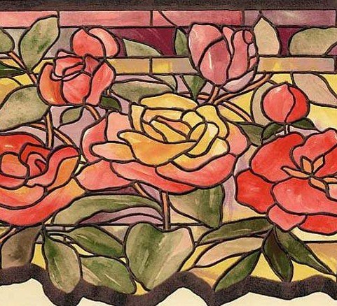 -. Title : Wallpaper Border Victorian Floral Stained Glass Pink, Orange, Red, Green