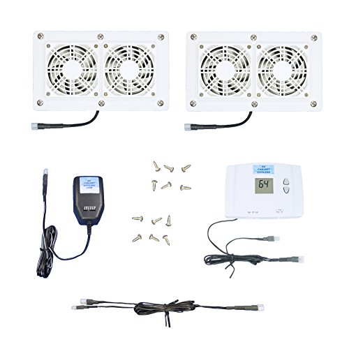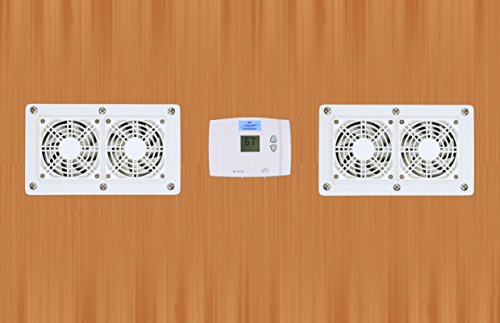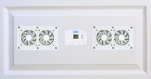 -. Feature : This cooling system is designed to be mounted in your enclosed equipment cabinet or computer desk. It will quietly exhaust the hot air outside, or pull cooling air into the cabinet, or both -- you choose how it is set up. It has two fan units, each with 2 high-quality, low-noise 80mm fans mounted together (4 fans total). / The system also includes an adjustable digital thermostat. In addition, YOU control the fan speed, using the multi-speed fan controller. / This model has a white mounting plate and front grill, and stainless silver screws on the front. The back (non-visible) side is black. The fan units are connected by a 2-way power distribution cable, which allows you to separate the fans by up to 7 feet apart. / The 80mm dual-fan cabinet cooling units measure approximately 4-5/8" high x 8" wide, which includes the mounting plate. The required hole is approximately 3-1/4" high x 6-5/8" wide. The unit is 1-1/4" thick behind the mounting plate, and only requires about 1/3" additional space behind the back of the fan to allow for airflow. / Recommended fan speeds for this system: The two 80mm fan units (running together) are rated at 22db, while moving 112 cubic feet of air per minute (3/4 speed). They have approximately these specs at different speeds: 1/2 speed = 74CFM at 16db, 2/3 speed = 98CFM at 19db , and full speed = 148CFM at 25db (approximate). With component cooling, slow (and quiet) are the way to go!