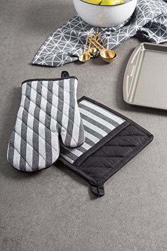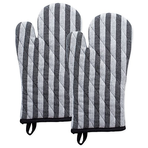 DII 100% Cotton Jacquard Quilted Oven Mitts Set, 6.5x12" Set of 2, Black and White Geometric design, Heat Resistant and Machine washable for Every Home Kitchen-Stripe