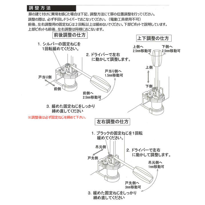 ●扉を閉じた状態で、上下・左右・前後に調整が可能です。