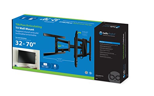 -. Brand : Bell'O -. Feature : Dimensions: 27.52W x 17.79D x 2.3H inches / Durable steel construction / Powder-coated piano black finish / Tilts -3 to +15 degrees with easy-to-reach strap / Arm extends 2.3-21.3 inches from wall -. Label : Twin-Star International Inc -. Manufacturer : Twin-Star International Inc -. MPN : 7846B -. PackageQuantity : 1 -. PartNumber : 7846B -. ProductGroup : Furniture -. ProductTypeName : HOME_FURNITURE_AND_DECOR -. Publisher : Twin-Star International Inc -. Studio : Twin-Star International Inc -. Title : Bell'O Tilt / Pan Articulating Wall Mount for 32 - 70 in. TVs