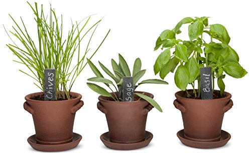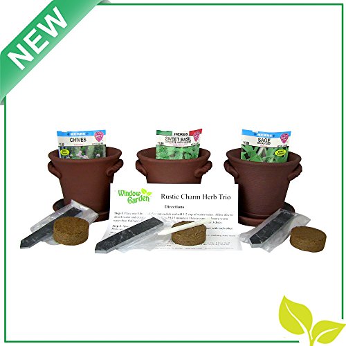 Window Garden Rustic Charm Herb Trio Grow Kit with Planter Pots, Slate Markers, Fiber Soil, Germination Bags, Basil, Chive and Sage Seeds